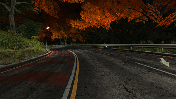 ライトアップされた紅葉の下は、3車線コーナー。路面が荒れているので紅葉に見とれないように用心を。