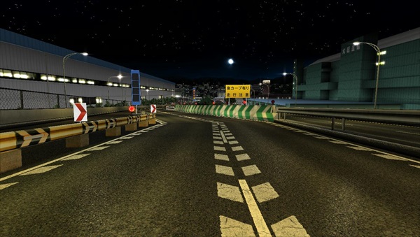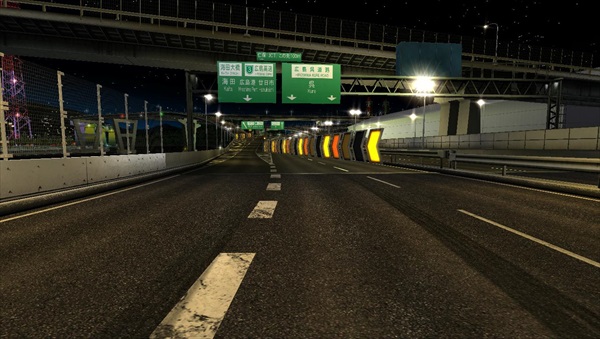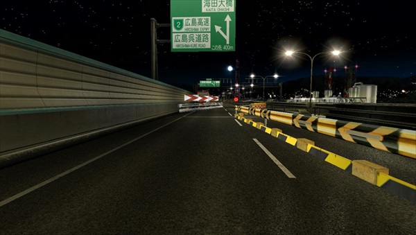 実際の道路では、東雲IC~仁保JCT間で中央にパイロンが置かれた対面通行区間であるが、本作ではその区間の中央が壁となっている。