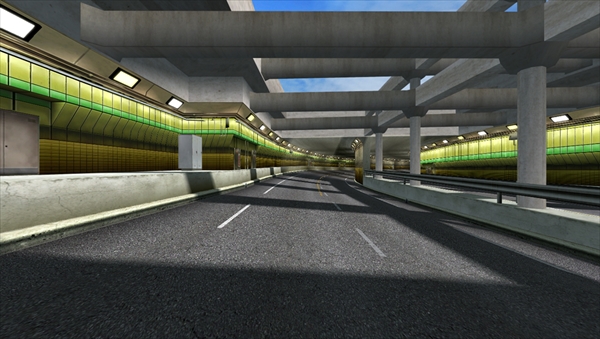 地下を走る空間ながらも、天井のすき間から空や建物が垣間見えたり、柱の向こうに対向車線が見えたり、意外と開けている区間。